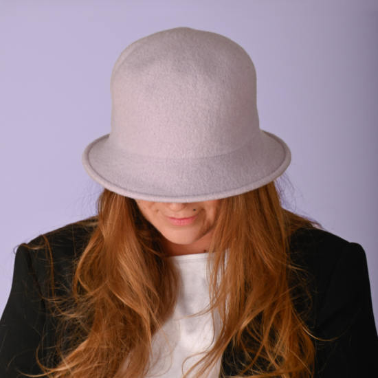 These seaside beanies are made from two colors combined in stripes. The brim is turned up.